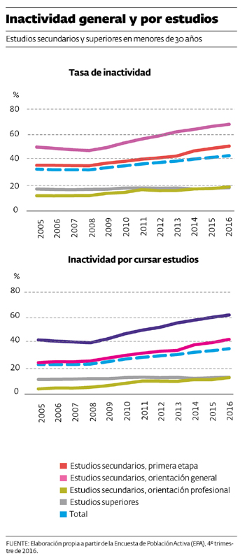 Los datos que recoge el informe afirman que con la crisis se ha producido un incremento de la inactividad. En 2008 eran inactivos el 32,5% de los jóvenes menores de 30 años, desde entonces la inactividad ha llegado al 44,5% en 2016. La crisis económica provocó un cambio radical en la situación de los jóvenes que, aunque tuvieran poca cualificación, encontraban trabajo con facilidad. Por este motivo, la inactividad ha aumentado, no tanto por los que tenían estudios secundarios, entre quienes es más habitual continuar los estudios, sino por quienes tenían niveles educativos medios y bajos, que han visto en la vuelta a la formación reglada “una forma de mejorar sus probabilidades de integración laboral cuando el empleo vuelva a crecer”, afirma Cueto en el dosier.